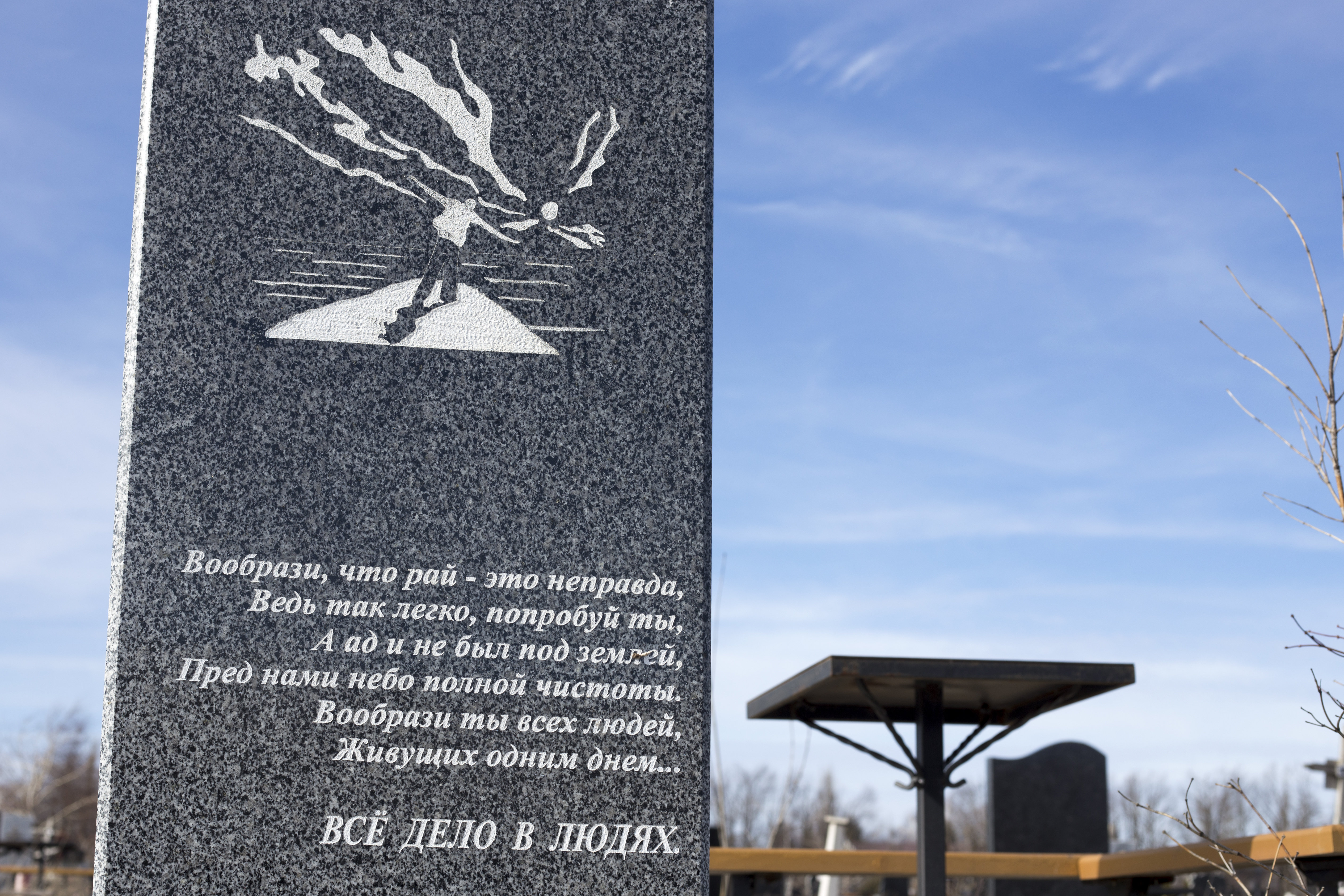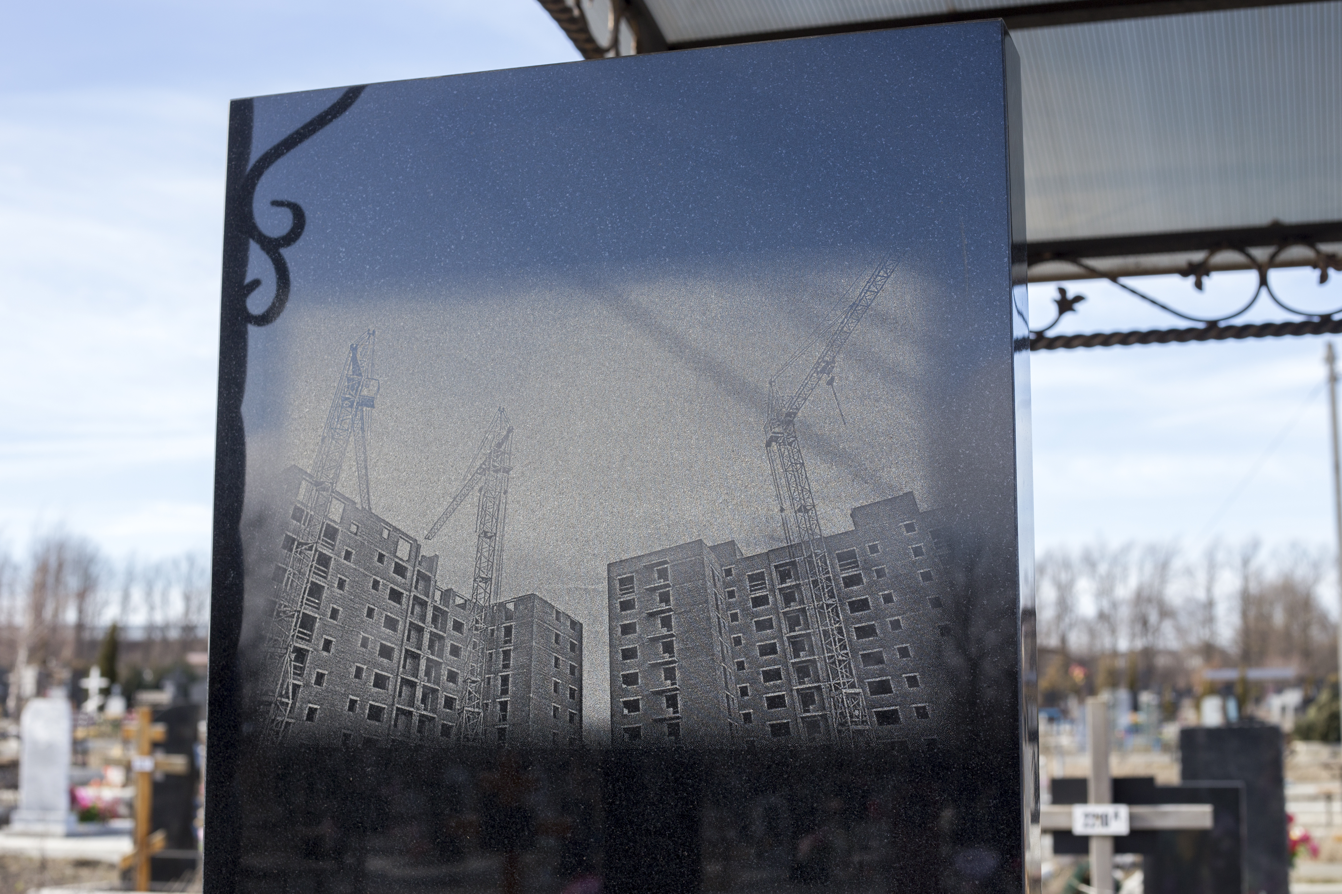Вместо крестов и серых надгробных плит все чаще встречаются иконические изображения, на которых застыли истребители в полете и самолеты гражданской авиации, корабли и городские пейзажи стройки.